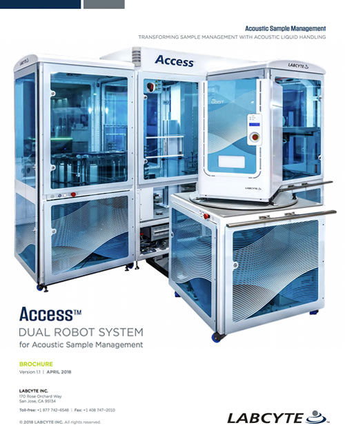 To meet the broad spectrum of sample throughput needs, the Echo 650T Liquid Handler seamlessly integrates with the highly configurable Access™ Dual Robot System accommodating a wide variety of devices and enabling a fully automated workflow.